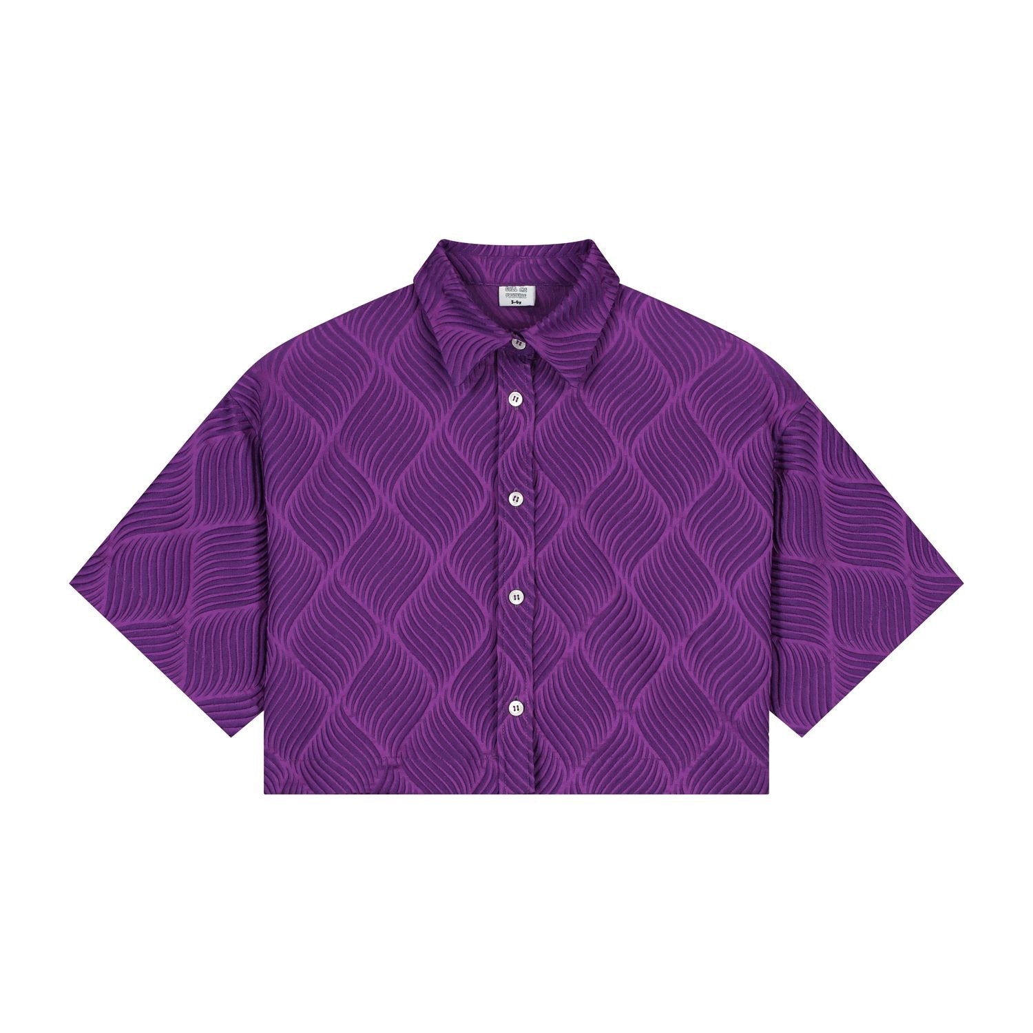This bold purple blouse stands out with its wavy all-over pattern and boxy cropped fit. With button-down detailing and short sleeves, it’s the perfect mix of playful and chic.